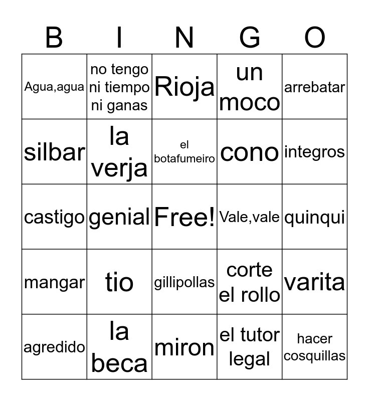 This bingo card has a free space and 24 words: tio, la beca, el botafumeiro, agredido, arrebatar, Agua,agua, silbar, no tengo ni tiempo ni ganas, Vale,vale, gillipollas, cono, castigo, corte el rollo, varita, la verja, el tutor legal, quinqui, Rioja, integros, genial, hacer cosquillas, mangar, un moco and miron.
