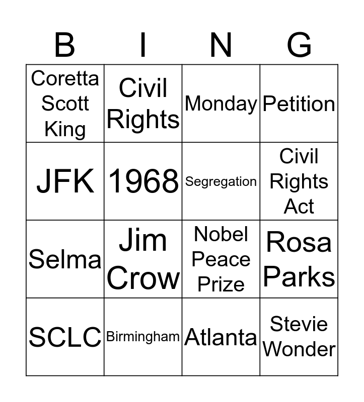 This bingo card has 26 words: Free!, Voting Rights Act, Civil Rights Act, I Have a Dream, JFK, Coretta Scott King, 1968, Civil Rights, Atlanta, March on Washington, Selma, Nobel Peace Prize, January, Holiday, Rosa Parks, Malcolm X, Petition, Stevie Wonder, Monday, SCLC, Jim Crow, Nonviolence, Birmingham, MLK, Segregation and Happy Birthday.