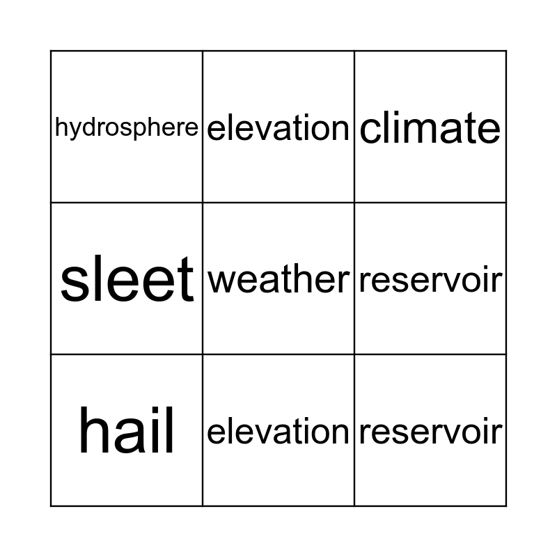 ⚠ This card has duplicate items: precipitation (2), current (2), hail (2), reservoir (2), climate (2), elevation (2), evaporation (2), hydrosphere (2), humidity (2), latitude (2), sleet (2), condensation (2)