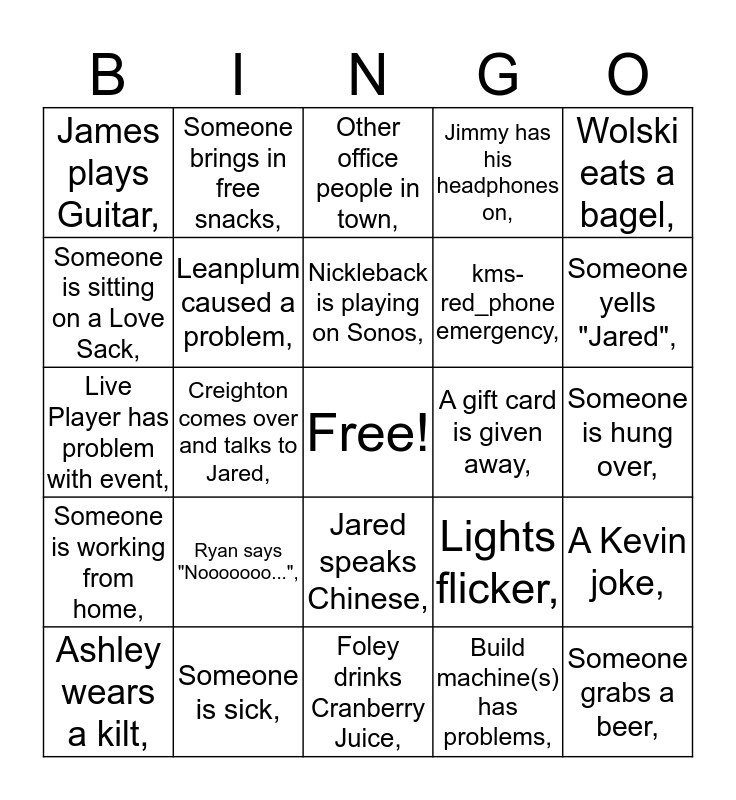 This bingo card has a free space and 25 words: Ryan says "Nooooooo...",, Foley drinks Cranberry Juice,, Nickleback is playing on Sonos,, Ashley wears a kilt,, Wolski eats a bagel,, James plays Guitar,, Someone is sitting on a Love Sack,, Someone brings in free snacks,, A gift card is given away,, Jared speaks Chinese,, kms-red_phone emergency,, Live Player has problem with event,, Lights flicker,, A Kevin joke,, Leanplum caused a problem,, Elevators don't work,, Someone is hung over,, Other office people in town,, Someone yells "Jared",, Creighton comes over and talks to Jared,, Someone grabs a beer,, Someone is sick,, Someone is working from home,, Jimmy has his headphones on, and Build machine(s) has problems,.