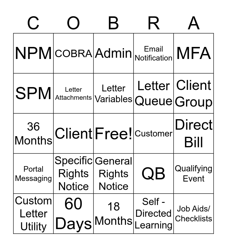 This bingo card has a free space and 29 words: Custom Letter Utility, Logos, Client, Nightly Files, NPM, Admin, Letter Attachments, Specific Rights Notice, Customer, 60 Days, Direct Bill, Job Aids/ Checklists, 18 Months, Self -Directed Learning, Client Group, Online Help, General Rights Notice, Portal Messaging, MFA, 36 Months, QB, 45 Days, Letter Queue, SPM, Email Notification, COBRA, Qualifying Event, Letter Variables and Maureen and Fasha.