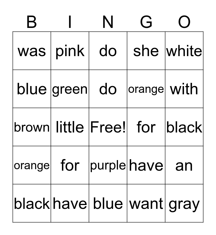 This bingo card has a free space and 56 words: you, black, is, was, blue, are, green, my, orange, purple, she, pink, with, red, brown, he, white, little, yellow, gray, for, of, have, do, you, do, my, are, with, he, she, is, was, little, black, blue, brown, green, orange, pink, purple, red, white, yellow, gray, for, have, of, they, said, want, me, play, it, an and because.