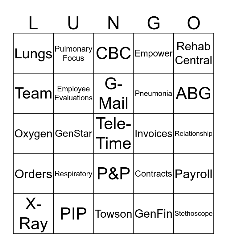 This bingo card has 51 words: Labor Log, Tele-Time, Pt. Service Logs, Towson, Respiratory, Ventilator, Pulmonary Focus, Sleep Studies, Team, HR, Employee Evaluations, Empower, Payroll, Contracts, Best Practice, IT, G-Mail, Invoices, GenServ, Rehab Central, GenStar, GenFin, Lungs, Pneumonia, Atelectasis, Stethoscope, ABG, Pulse Oximetry, X-Ray, CBC, Dedication, Nutrition, RMT, P&L’s, CAP, PIP, Marketing, Patients, Recruiting, Trust, Relationship, Orders, Engage Pride, Acapella, Bedside PFT, 6 Minute Walk, Oxygen, CHF, COPD, P&P and Mandatory Education.