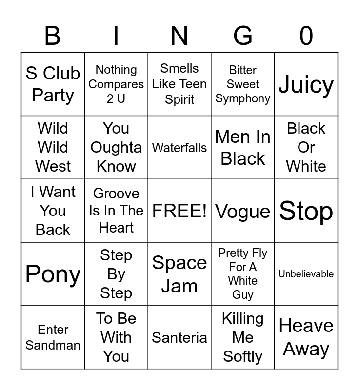 This bingo card has a free space and 34 words: Fantasy, Killing Me Softly, Baby One More Time, Torn, Pony, You Oughta Know, Juicy, Enter Sandman, Nothing Compares 2 U, Loser, Waterfalls, Smells Like Teen Spirit, What's Up, If You Had My Love, Vogue, Black Or White, To Be With You, I Want You Back, Step By Step, Pretty Fly For A White Guy, Space Jam, Joyride, S Club Party, Stop, Santeria, Heave Away, Bitter Sweet Symphony, Ice Ice Baby, Men In Black, Wild Wild West, Mr Jones, Groove Is In The Heart, Unbelievable and Don't Go Breaking My Heart.