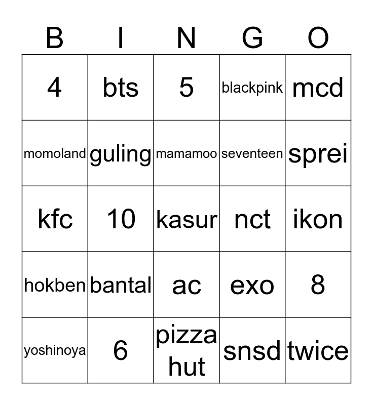 This bingo card has a free space and 24 words: bantal, 6, mamamoo, yoshinoya, mcd, 4, momoland, bts, nct, ac, seventeen, kfc, exo, 8, guling, snsd, ikon, 5, sprei, 10, twice, hokben, blackpink and pizza hut.
