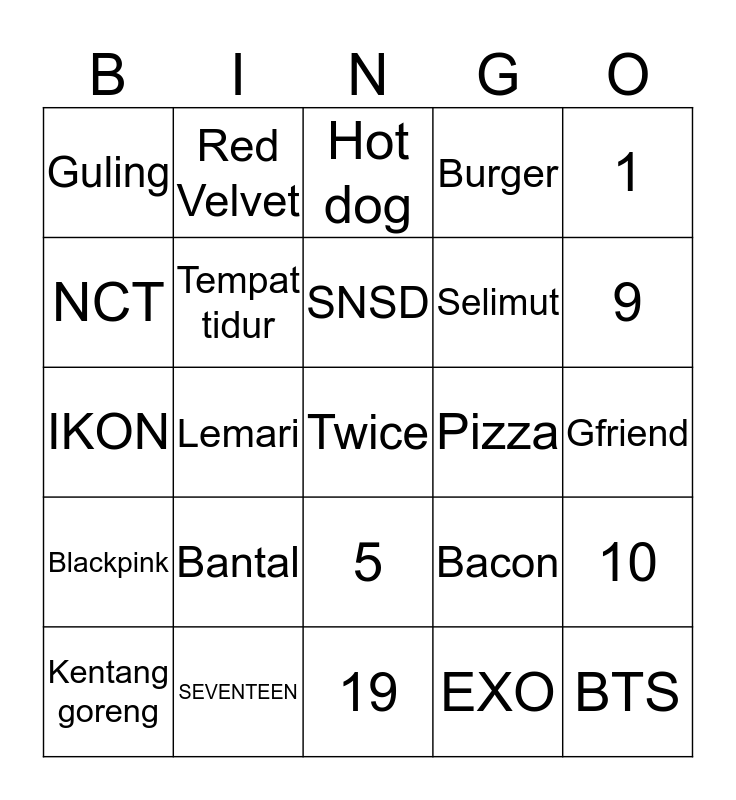 This bingo card has a free space and 24 words: Bantal, SEVENTEEN, SNSD, Kentang goreng, 1, Guling, NCT, Red Velvet, Pizza, 5, Selimut, IKON, Bacon, 10, Tempat tidur, EXO, Gfriend, Hot dog, 9, Lemari, BTS, Blackpink, Burger and 19.