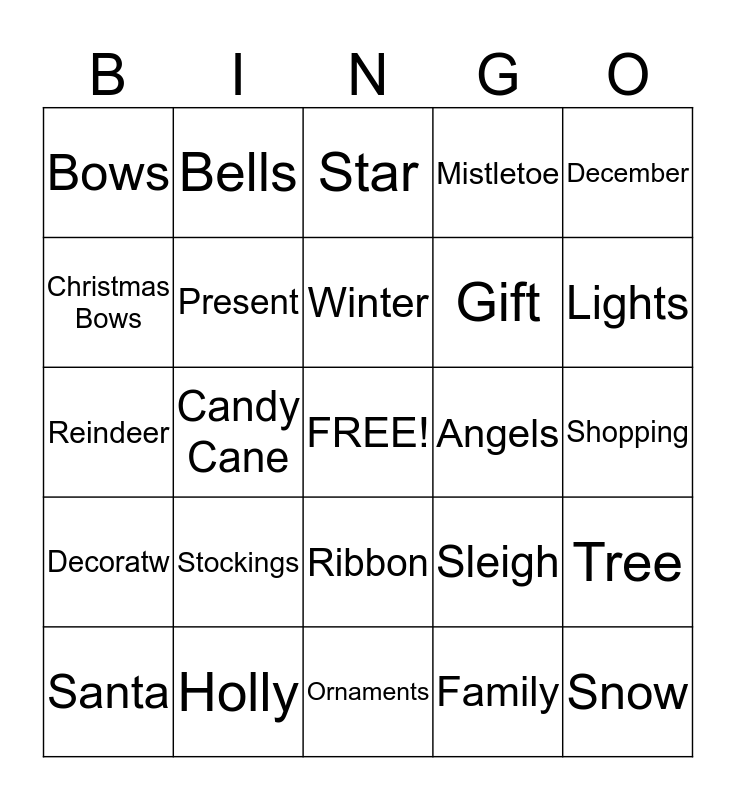 This bingo card has a free space and 24 words: Stockings, Holly, Winter, Santa, December, Bows, Christmas Bows, Bells, Angels, Ribbon, Gift, Reindeer, Sleigh, Tree, Present, Family, Shopping, Star, Lights, Candy Cane, Snow, Decoratw, Mistletoe and Ornaments.
