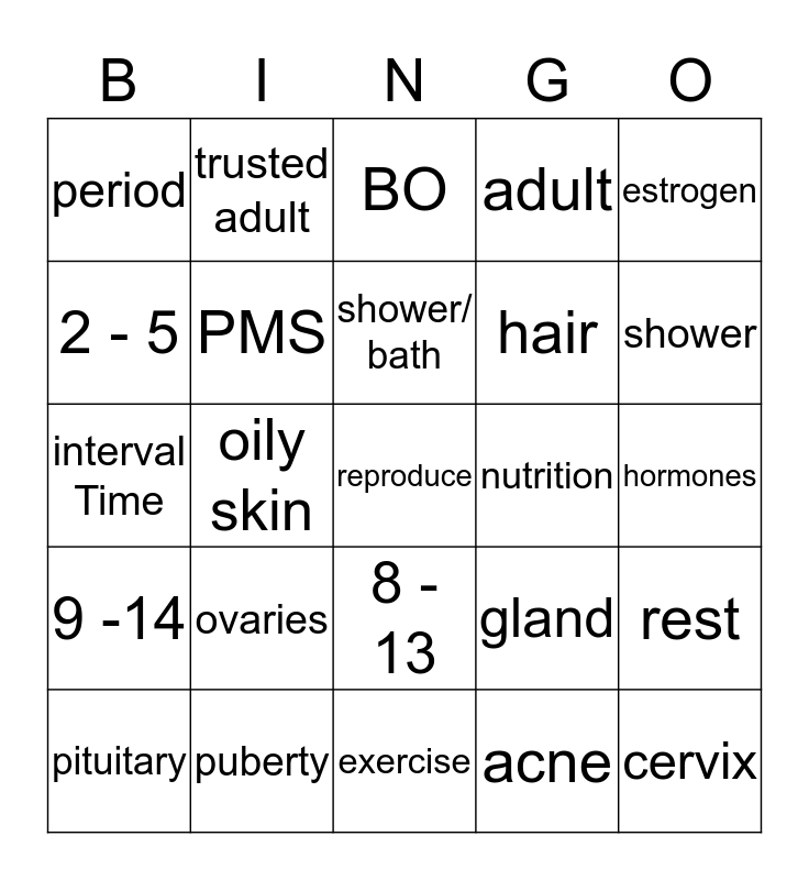 This bingo card has a free space and 29 words: pituitary, Sebum, oily skin, Uterus, period, BO, PMS, ovaries, nutrition, puberty, hormones, cervix, exercise, acne, shower, Fallopian, 8 - 13, 9 -14, estrogen, interval Time, gland, brain, hair, 2 - 5, adult, trusted adult, rest, shower/ bath and pack.