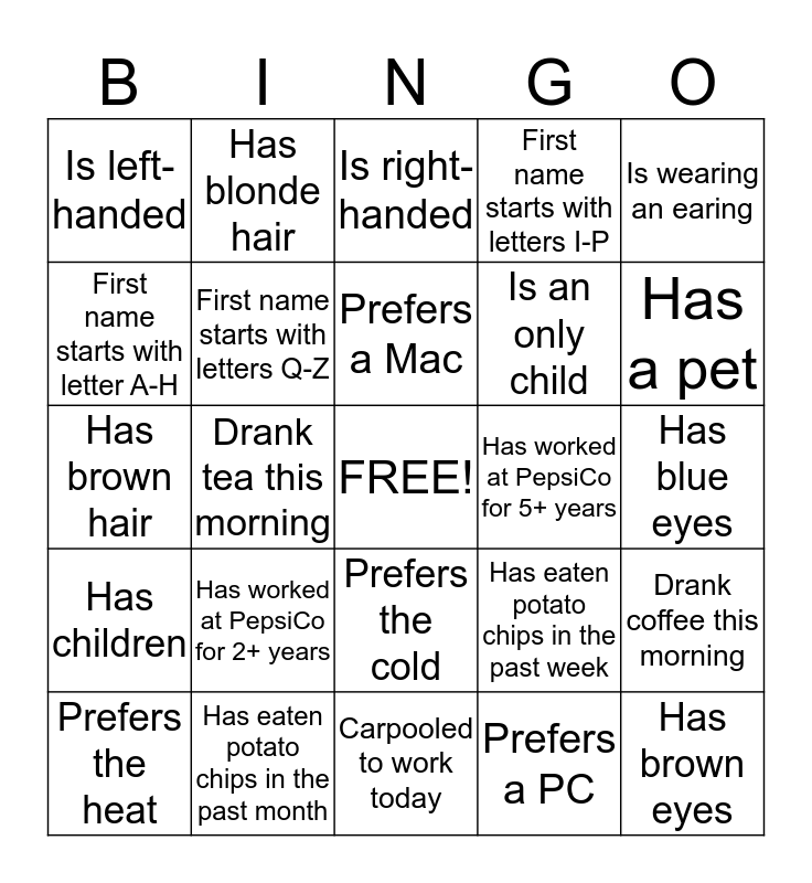 This bingo card has a free space and 24 words: Has worked at PepsiCo for 2+ years, Has eaten potato chips in the past month, Prefers a Mac, Prefers the heat, Is wearing an earing, Is left-handed, First name starts with letter A-H, Has blonde hair, Has worked at PepsiCo for 5+ years, Prefers the cold, Is an only child, Has brown hair, Has eaten potato chips in the past week, Drank coffee this morning, First name starts with letters Q-Z, Prefers a PC, Has blue eyes, Is right-handed, Has a pet, Drank tea this morning, Has brown eyes, Has children, First name starts with letters I-P and Carpooled to work today.