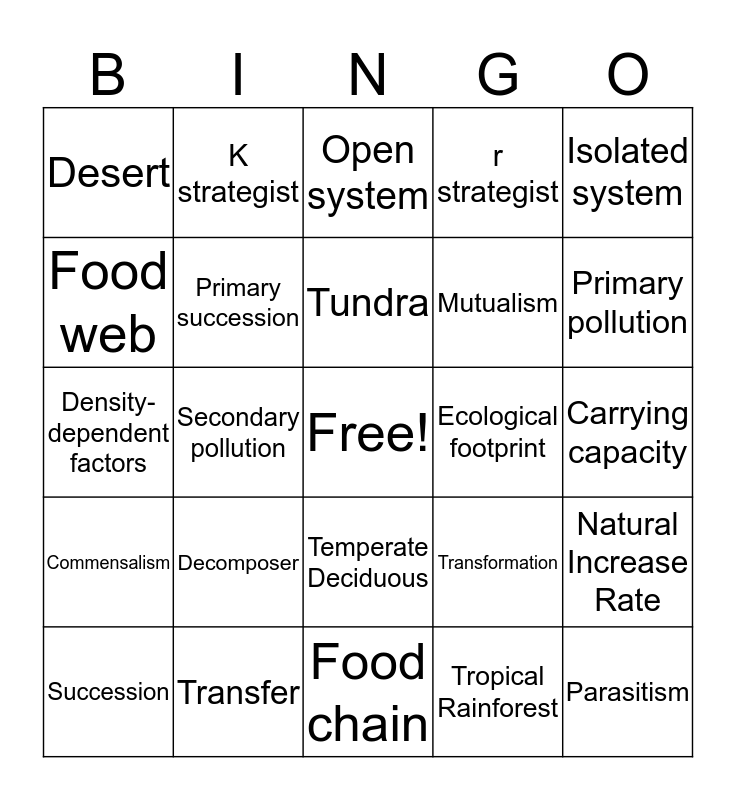 This bingo card has a free space and 24 words: Decomposer, Transfer, Tundra, Succession, Isolated system, Desert, Food web, K strategist, Ecological footprint, Temperate Deciduous, Mutualism, Density-dependent factors, Transformation, Natural Increase Rate, Primary succession, Tropical Rainforest, Carrying capacity, Open system, Primary pollution, Secondary pollution, Parasitism, Commensalism, r strategist and Food chain.