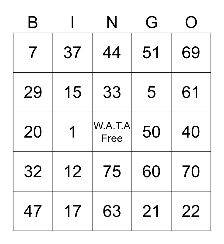 This bingo card has a free space and 24 words: 12, 17, 33, 47, 69, 7, 29, 37, 50, 75, 5, 20, 60, 70, 15, 21, 40, 44, 61, 1, 22, 32, 51 and 63.
