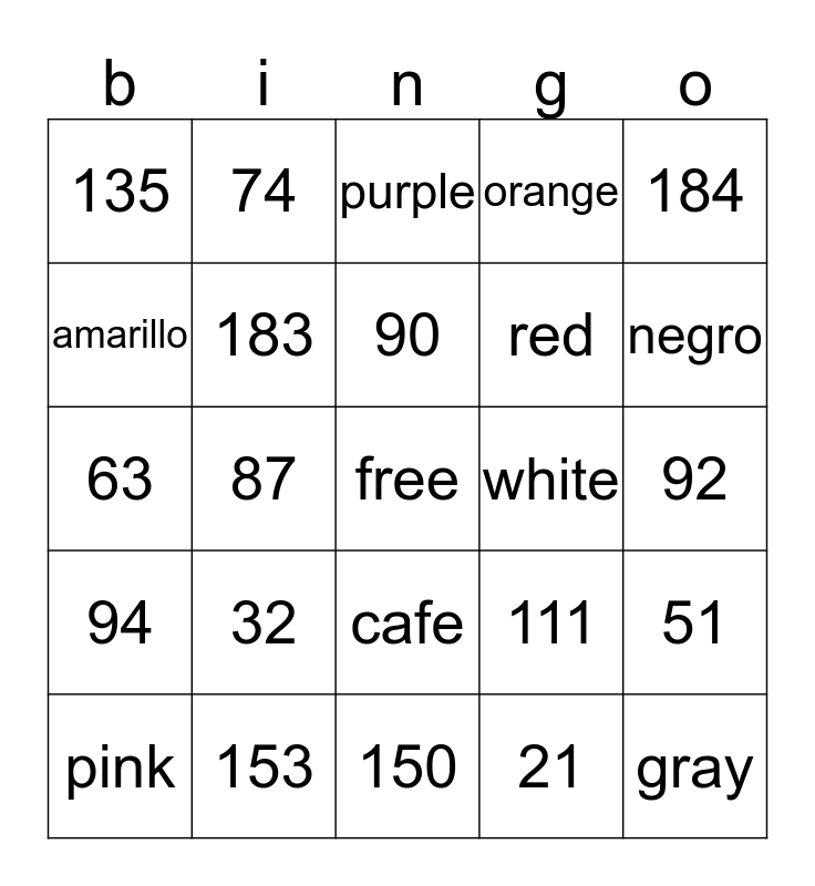 This bingo card has a free space and 24 words: 32, 153, 90, pink, 184, 135, amarillo, 74, white, cafe, red, 63, 111, 51, 183, 21, 92, purple, negro, 87, gray, 94, orange and 150.