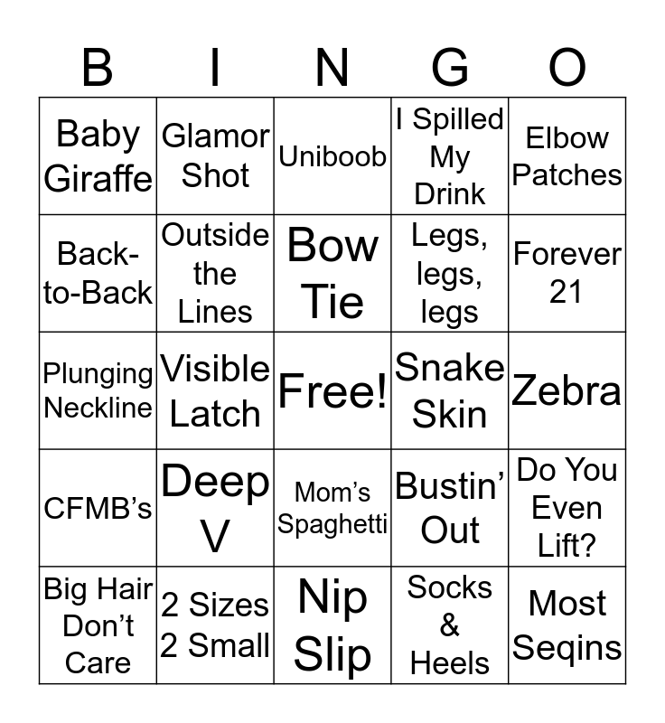 This bingo card has a free space and 24 words: Deep V, 2 Sizes 2 Small, Bow Tie, Big Hair Don’t Care, Elbow Patches, Baby Giraffe, Back-to-Back, Glamor Shot, Snake Skin, Mom’s Spaghetti, Legs, legs, legs, Plunging Neckline, Bustin’ Out, Do You Even Lift?, Outside the Lines, Socks & Heels, Zebra, Uniboob, Forever 21, Visible Latch, Most Seqins, CFMB’s, I Spilled My Drink and Nip Slip.