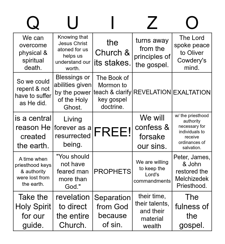 This bingo card has a free space and 24 words: "You should not have feared man more than God.", revelation to direct the entire Church., The Book of Mormon to teach & clarify key gospel doctrine., Take the Holy Spirit for our guide., The Lord spoke peace to Oliver Cowdery's mind., We can overcome physical & spiritual death., So we could repent & not have to suffer as He did., Knowing that Jesus Christ atoned for us helps us understand our worth., We will confess & forsake our sins., PROPHETS, REVELATION, is a central reason He created the earth., We are willing to keep the Lord's commandments, Peter, James, & John restored the Melchizedek Priesthood., Blessings or abilities given by the power of the Holy Ghost., their time, their talents, and their material wealth, w/ the priesthood authority necessary for individuals to receive ordinances of salvation., the Church & its stakes., EXALTATION, Living forever as a resurrected being., The fulness of the gospel., A time when priesthood keys & authority were lost from the earth., turns away from the principles of the gospel. and Separation from God because of sin..