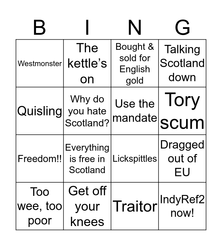 This bingo card has 16 words: Get off your knees, Dragged out of EU, Bought & sold for English gold, Westmonster, Freedom!!, The kettle’s on, Lickspittles, Traitor, Quisling, Why do you hate Scotland?, Too wee, too poor, Talking Scotland down, Everything is free in Scotland, Tory scum, Use the mandate and IndyRef2 now!.
