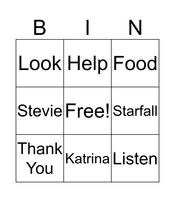This bingo card has a free space and 8 words: Starfall, Food, Help, Thank You, Look, Listen, Stevie and Katrina.