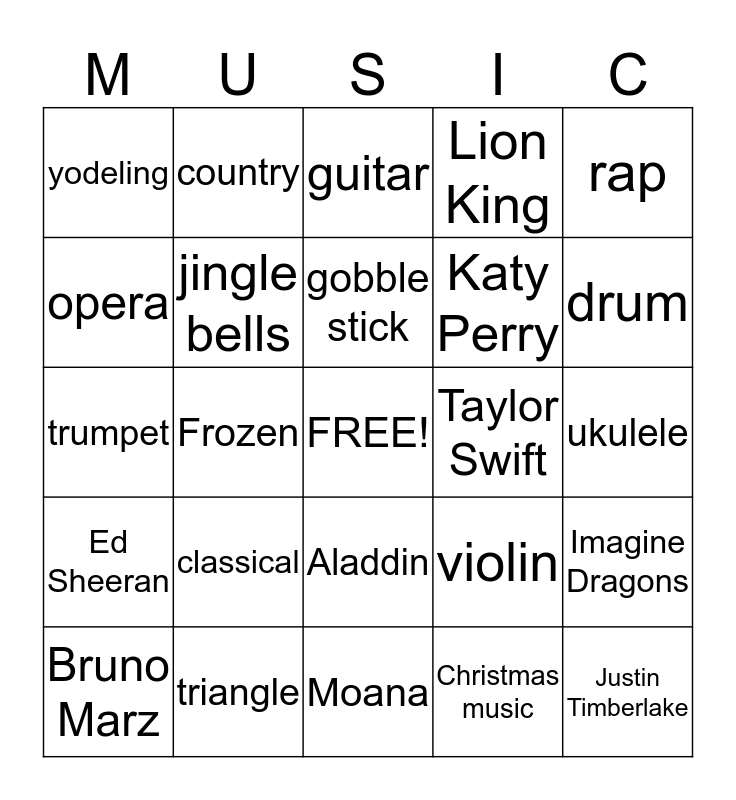 This bingo card has a free space and 24 words: classical, triangle, gobble stick, Bruno Marz, rap, yodeling, opera, country, Taylor Swift, Aladdin, Katy Perry, trumpet, violin, Imagine Dragons, jingle bells, Christmas music, ukulele, guitar, drum, Frozen, Justin Timberlake, Ed Sheeran, Lion King and Moana.