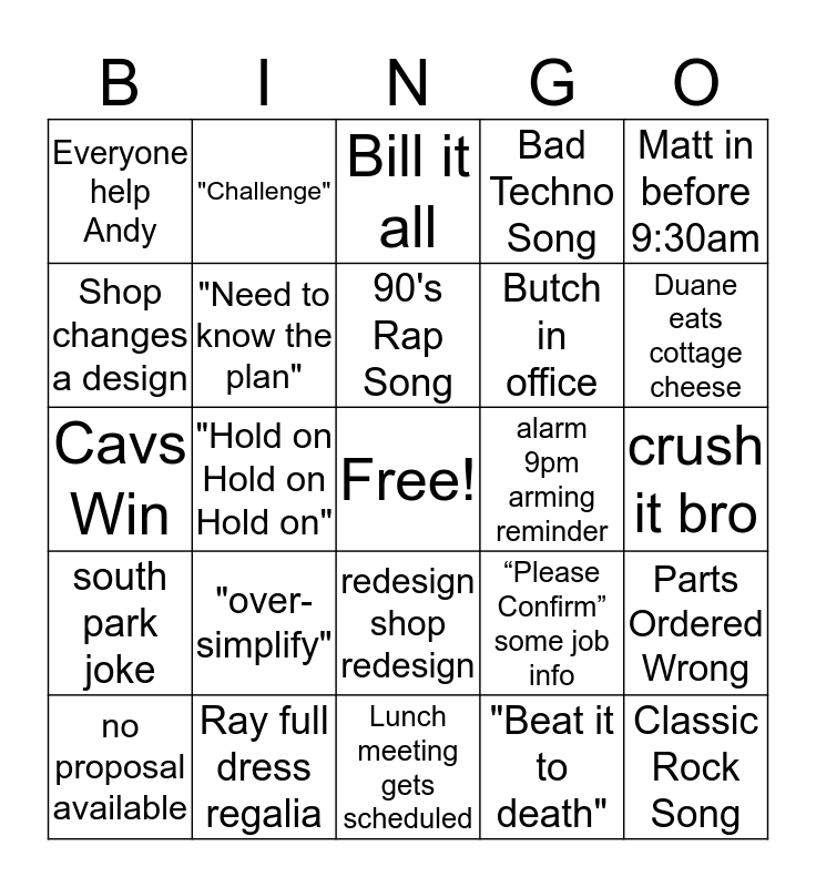This bingo card has a free space and 46 words: "Just like" Insert job name, Classic Rock Song, Duane working from home, Lunch meeting gets scheduled, "over-simplify", alarm off at 4am, "Challenge", Vegan joke, Shop changes a design, “Are the as builts done”, "Need to know the plan", Bad Techno Song, Parts Ordered Wrong, “Please Confirm” some job info, "Who’s got the ball?”, alarm off at 5am, 90's Rap Song, alarm 9pm arming reminder, Loud Whats Up, Matt in before 9:30am, "Hold on Hold on Hold on", "Beat it to death", Everyone help Andy, Butch in office, forgot to order parts, Duane eats cottage cheese, no proposal available, office temp hits 67, redesign shop redesign, south park joke, CMSD service ticket, Weird Music, Do you know how many emails, Duane needs seat saved, re-do subcontract work, Ray full dress regalia, crush it bro, NERD TALK!, Matt in after 11:30, Ashleigh buys candy, Country Music Song ☹, Bill it all, Cavs Win, Duane makes someone move, Linus comes to work and Ashleigh Disarms alarm.