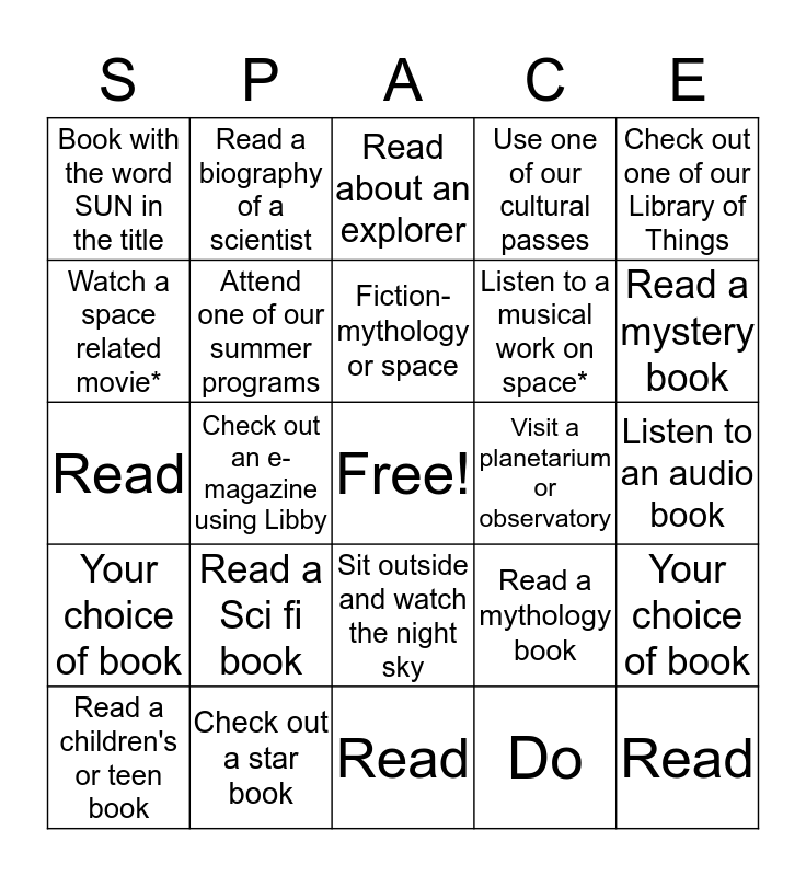 This bingo card has a free space and 24 words: Read a Sci fi book, Check out a star book, Fiction- mythology or space, Read a children's or teen book, Check out one of our Library of Things, Book with the word SUN in the title, Watch a space related movie*, Read a biography of a scientist, Visit a planetarium or observatory, Sit outside and watch the night sky, Listen to a musical work on space*, Read, Read a mythology book, Your choice of book, Attend one of our summer programs, Do, Listen to an audio book, Read about an explorer, Read a mystery book, Check out an e-magazine using Libby, Read, Your choice of book, Use one of our cultural passes and Read.