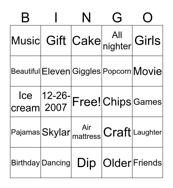 This bingo card has a free space and 29 words: Birthday, Candles, 12-26-2007, Pizza, Music, Cake, Eleven, Skylar, Chips, Dancing, Games, Friends, Dip, Older, Movie, Pillow, Air mattress, Pajamas, Girls, Ice cream, Craft, Candy, Popcorn, Beautiful, All nighter, Gift, Laughter, Giggles and Won’t sleep.