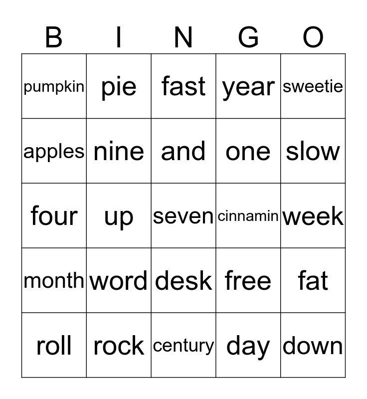 This bingo card has a free space and 24 words: word, rock, and, roll, sweetie, pumpkin, apples, pie, cinnamin, desk, one, four, free, fat, nine, day, week, fast, slow, up, down, month, year and century.
