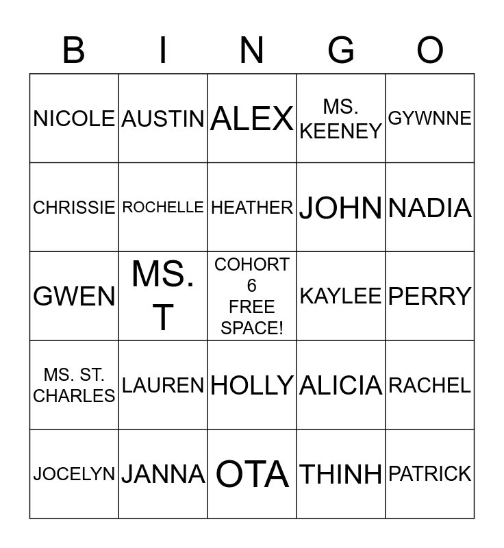 This bingo card has a free space and 24 words: LAUREN, JANNA, HEATHER, JOCELYN, GYWNNE, NICOLE, CHRISSIE, AUSTIN, KAYLEE, HOLLY, JOHN, GWEN, ALICIA, RACHEL, ROCHELLE, THINH, PERRY, ALEX, NADIA, MS. T, PATRICK, MS. ST. CHARLES, MS. KEENEY and OTA.