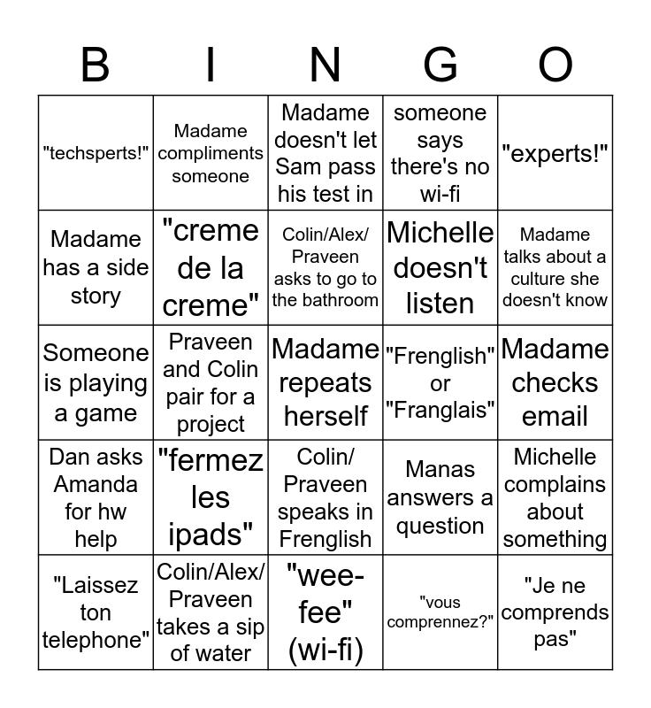 This bingo card has a free space and 24 words: "fermez les ipads", Colin/Alex/ Praveen takes a sip of water, Colin/Alex/ Praveen asks to go to the bathroom, "Laissez ton telephone", "experts!", "techsperts!", Madame has a side story, Madame compliments someone, "Frenglish" or "Franglais", Colin/ Praveen speaks in Frenglish, Michelle doesn't listen, Someone is playing a game, Manas answers a question, Michelle complains about something, "creme de la creme", "vous comprennez?", Madame checks email, Madame doesn't let Sam pass his test in, Madame talks about a culture she doesn't know, Praveen and Colin pair for a project, "Je ne comprends pas", Dan asks Amanda for hw help, someone says there's no wi-fi and "wee-fee" (wi-fi).
