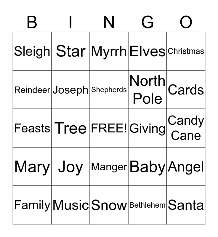 This bingo card has a free space and 32 words: Bethlehem, Gingerbread, Tree, Presents, Mary, Joseph, Christmas, Angel, Star, Wise Men, Shepherds, Myrrh, Gold, Gifts, Giving, Love, Family, Feasts, Manger, Joy, Baby, Luke 2, Candy Cane, Music, Santa, Elves, North Pole, Reindeer, Sleigh, Snow, Stories and Cards.