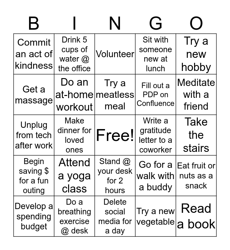 This bingo card has a free space and 24 words: Attend a yoga class, Do a breathing exercise @ desk, Try a meatless meal, Develop a spending budget, Try a new hobby, Commit an act of kindness, Get a massage, Drink 5 cups of water @ the office, Write a gratitude letter to a coworker, Stand @ your desk for 2 hours, Fill out a PDP on Confluence, Unplug from tech after work, Go for a walk with a buddy, Eat fruit or nuts as a snack, Do an at-home workout, Try a new vegetable, Take the stairs, Volunteer, Meditate with a friend, Make dinner for loved ones, Read a book, Begin saving $ for a fun outing, Sit with someone new at lunch and Delete social media for a day.