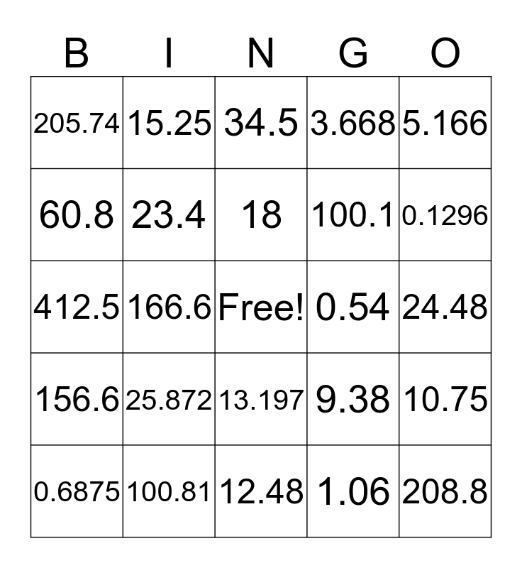 This bingo card has a free space and 24 words: 25.872, 100.81, 18, 0.6875, 5.166, 205.74, 60.8, 15.25, 0.54, 13.197, 100.1, 412.5, 9.38, 10.75, 23.4, 1.06, 24.48, 34.5, 0.1296, 166.6, 208.8, 156.6, 3.668 and 12.48.
