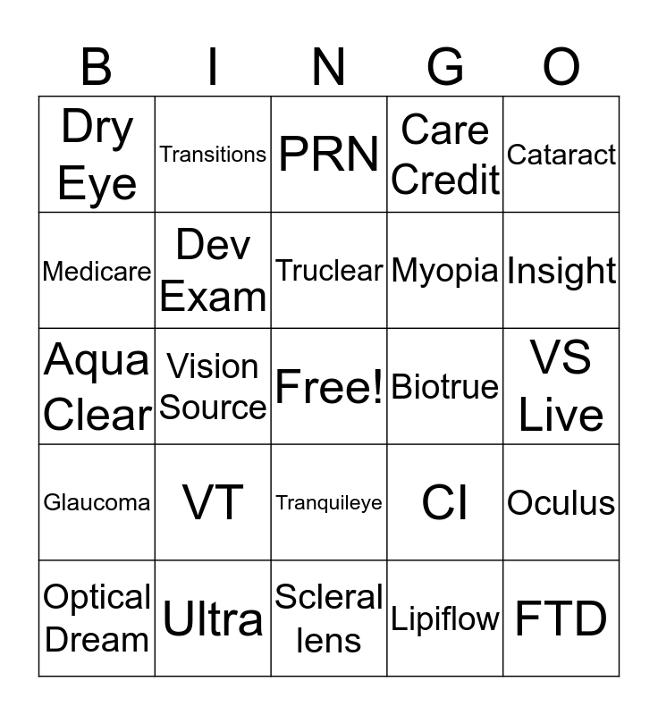 This bingo card has a free space and 42 words: Viso, Truclear, CRT, VT, Lipiflow, Oculus, FTD, Macuhealth, PRN, Tranquileye, VS Live, Insight, Vision Source, Cataract, Lazy eye, CI, California, Aqua Clear, MGD, Transitions, Medicare, Vision vs Medical, ED Avoidance, Dry Eye, AMD, Maculogix, Myopia, Hyperopia, Presbyopia, Eyezen, Blue Light, Glaucoma, Dev Exam, Scleral lens, Frame Dream, Optical Dream, Ultra, Biotrue, OGS, RPP, Care Credit and Pair 50.