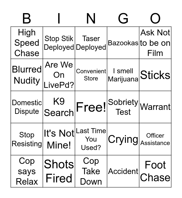This bingo card has a free space and 29 words: Cop says Relax, How much have you had to drink, K9 Search, Weed Found in Car/on Person, High Speed Chase, Taser Deployed, Are We On LivePd?, It's Not Mine!, Sobriety Test, Shots Fired, Warrant, Foot Chase, Cop Take Down, Accident, Sticks, Stolen Vehicle, Last Time You Used?, Stop Resisting, Ask Not to be on Film, Domestic Dispute, Crying, Hooker, I smell Marijuana, Blurred Nudity, Bazookas, Stop Stik Deployed, Officer Assistance, Convenient Store and This happened earlier on Live Pd.