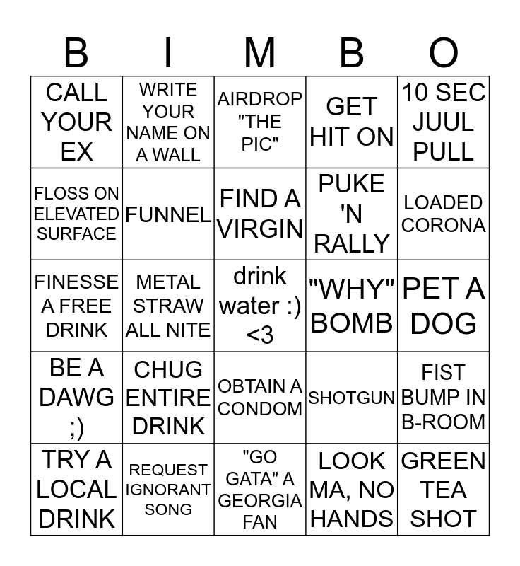 This bingo card has a free space and 24 words: CHUG ENTIRE DRINK, REQUEST IGNORANT SONG, FIND A VIRGIN, TRY A LOCAL DRINK, 10 SEC JUUL PULL, CALL YOUR EX, FLOSS ON ELEVATED SURFACE, WRITE YOUR NAME ON A WALL, "WHY" BOMB, OBTAIN A CONDOM, PUKE 'N RALLY, FINESSE A FREE DRINK, SHOTGUN, FIST BUMP IN B-ROOM, FUNNEL, LOOK MA, NO HANDS, PET A DOG, AIRDROP "THE PIC", LOADED CORONA, METAL STRAW ALL NITE, GREEN TEA SHOT, BE A DAWG ;), GET HIT ON and "GO GATA" A GEORGIA FAN.