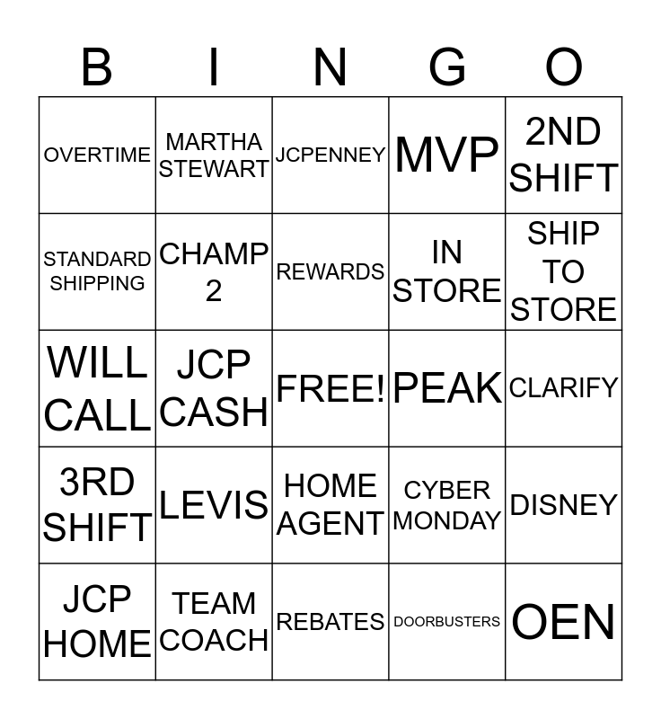 This bingo card has a free space and 41 words: STUDIO, WILL CALL, CHAMP 1, CHAMP 2, TEAM COACH, HOME AGENT, REWARDS, 1ST SHIFT, 2ND SHIFT, 3RD SHIFT, JCP CASH, MVP, OEN, CLARIFY, PEAK, LEVIS, NIKE, OVERTIME, JHELP, JCPENNEY, DISNEY, CALL CENTER, REBATES, IN STORE, ARIZONA, CUSTOMER 1ST, DOORBUSTERS, ORDER STATUS, SHIP TO STORE, KEURIG, GIFT WRAP, MARTHA STEWART, JCP HOME, EXPRESS SHIPPING, CYBER MONDAY, STANDARD SHIPPING, OSCAR, DOCKERS, JCP CREDIT CARD, FREE SHIPPING and RETURN POLICY.
