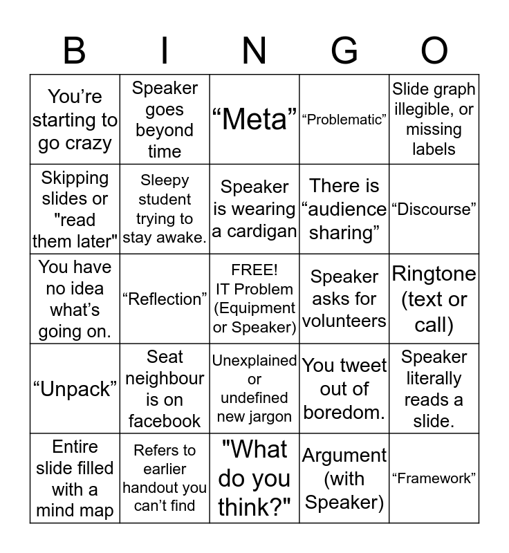 This bingo card has a free space and 24 words: Seat neighbour is on facebook, Refers to earlier handout you can’t find, Speaker is wearing a cardigan, Entire slide filled with a mind map, Slide graph illegible, or missing labels, You’re starting to go crazy, Skipping slides or "read them later", Speaker goes beyond time, Speaker asks for volunteers, Unexplained or undefined new jargon, There is “audience sharing”, You have no idea what’s going on., You tweet out of boredom., Speaker literally reads a slide., Sleepy student trying to stay awake., Argument (with Speaker), Ringtone (text or call), “Meta”, “Discourse”, “Reflection”, “Framework”, “Unpack”, “Problematic” and "What do you think?".