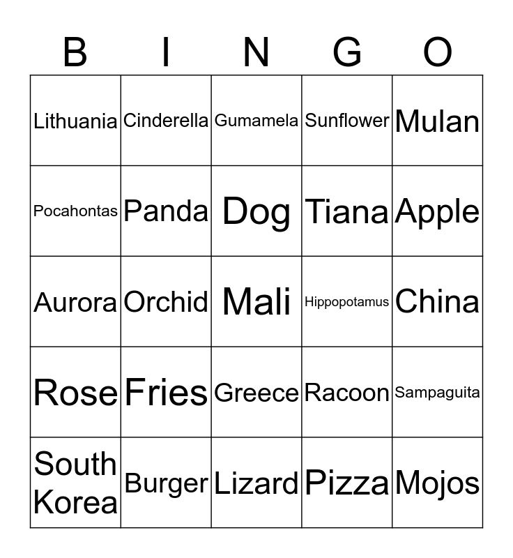This bingo card has 25 words: Rose, Burger, Mali, Pizza, Mulan, Lithuania, Cinderella, Gumamela, Hippopotamus, Sampaguita, Pocahontas, Panda, Lizard, Racoon, Apple, South Korea, Orchid, Dog, Tiana, China, Aurora, Fries, Greece, Sunflower and Mojos.