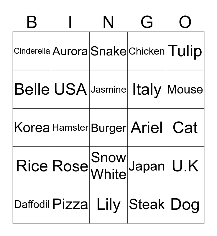 This bingo card has 25 words: Rose, Lily, Jasmine, Daffodil, Tulip, Cinderella, Belle, Aurora, Ariel, Snow White, Italy, Korea, Japan, U.K, USA, Dog, Cat, Snake, Mouse, Hamster, Burger, Pizza, Rice, Chicken and Steak.