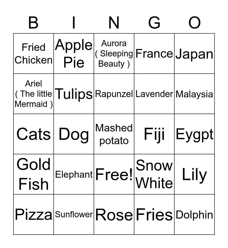 This bingo card has 26 words: Free!, Fries, Rapunzel, Sunflower, Japan, Fried Chicken, Ariel ( The little Mermaid ), Apple Pie, Eygpt, Snow White, Lavender, Cats, Lily, Pizza, Dog, Belle, France, Gold Fish, Aurora ( Sleeping Beauty ), Mashed potato, Malaysia, Rose, Fiji, Elephant, Tulips and Dolphin.