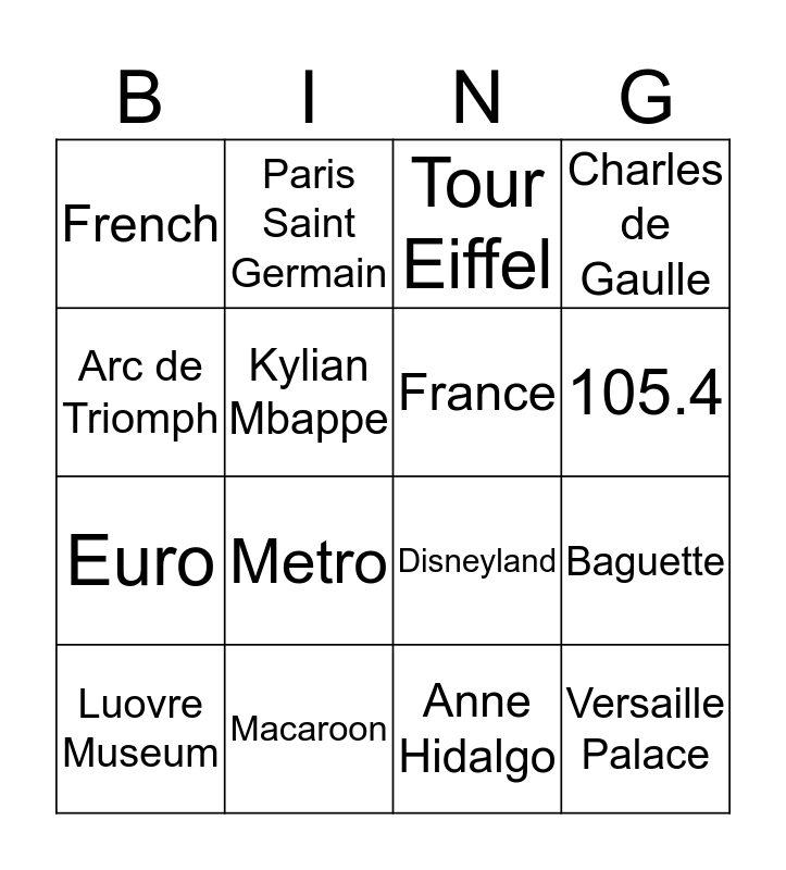 This bingo card has 20 words: Baguette, Champs Elysees, Tour Eiffel, croissant, Luovre Museum, Arc de Triomph, Macaroon, French, Euro, Paris Saint Germain, Metro, Disneyland, Kylian Mbappe, Versaille Palace, France, 2,200,000, 105.4, Charles de Gaulle, Anne Hidalgo and 4000 bc.