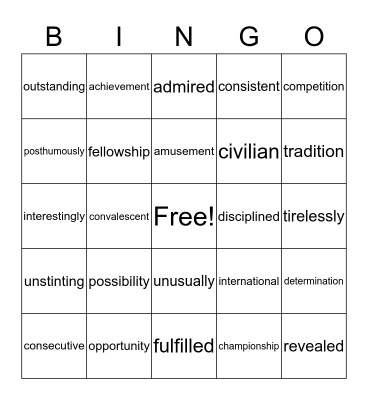 This bingo card has a free space and 44 words: additional, revealed, extra- ordinary, consecutive, performance, championship, admired, recognized, competition, opportunity, consistent, disciplined, unusually, possibility, twelfth, fulfilled, innings, interestingly, auction, tradition, achievement, cartilage, prodigy, outstanding, excellent, tirelessly, cholera, autobiography, international, unstinting, accomplish, determination, obstacles, established, convalescent, significant, ministering, tremendous, amusement, posthumously, civilian, selflessness, fellowship and contribution.