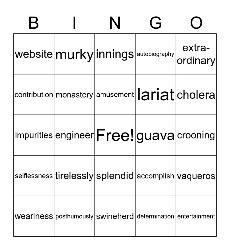 This bingo card has a free space and 104 words: additional, revealed, extra- ordinary, consecutive, performance, championship, admired, recognized, competition, opportunity, consistent, disciplined, unusually, possibility, twelfth, fulfilled, innings, interestingly, auction, tradition, achievement, cartilage, prodigy, outstanding, excellent, tirelessly, cholera, autobiography, international, unstinting, accomplish, determination, obstacles, established, convalescent, significant, ministering, tremendous, amusement, posthumously, civilian, selflessness, fellowship, contribution, communication, website, satellite, entertainment, prospered, belfry, canary, neighbour, enormous, surrender, curious, discovered, fierce, emperor, crescent, splendid, crooning, crockery, adventure, delighted, astonished, flourished, shredded, murky, impurities, engineer, swineherd, blacksmith, sentry, glutton, caterpillar, cocoon, swarming, weariness, appetites, gobbled, penguin, seldom, monastery, perfection, guava, corkscrew, amphibian, occasionally, anthills, icebergs, eclipse, stallion, tremendous, vaqueros, holster, rodent, coyotes, lariat, vultures, nuisance, tarantula, poisonous, shuddered and angrily.