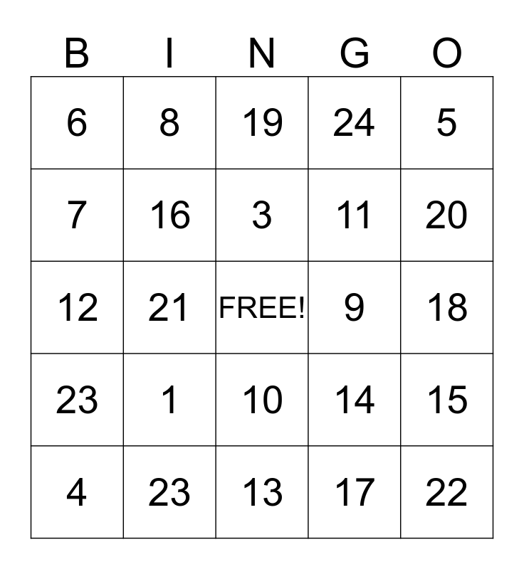 This bingo card has a free space and 24 words: 1, 23, 3, 4, 5, 6, 7, 8, 9, 10, 11, 12, 14, 15, 16, 17, 18, 19, 20, 21, 22, 23, 24 and 13.