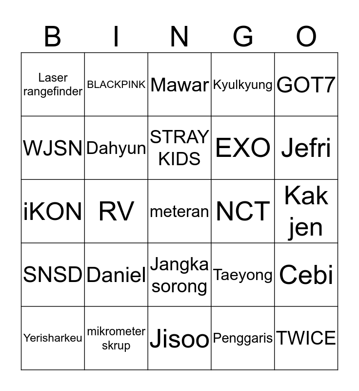 This bingo card has 25 words: SNSD, mikrometer skrup, meteran, Penggaris, GOT7, Laser rangefinder, BLACKPINK, Mawar, NCT, Cebi, WJSN, Dahyun, Jisoo, Taeyong, Jefri, Yerisharkeu, RV, STRAY KIDS, EXO, Kak jen, iKON, Daniel, Jangka sorong, Kyulkyung and TWICE.