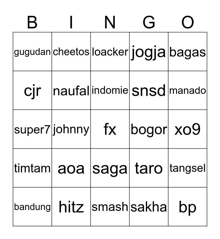 This bingo card has 25 words: aoa, smash, indomie, bandung, bagas, gugudan, cjr, cheetos, bogor, saga, snsd, super7, taro, tangsel, naufal, bp, xo9, loacker, manado, johnny, fx, hitz, timtam, jogja and sakha.