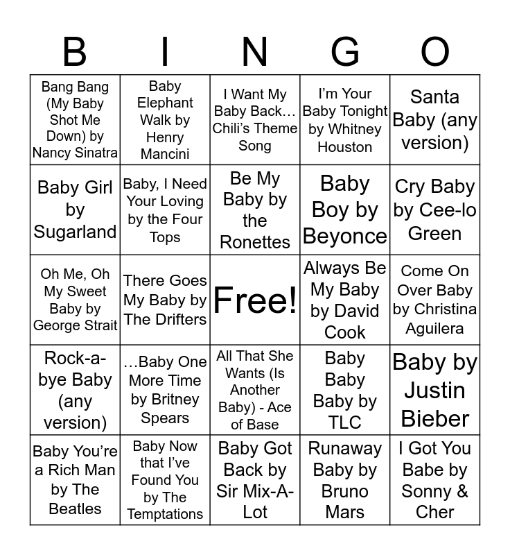 This bingo card has a free space and 50 words: Baby, Baby by Amy Grant, I Got You Babe by Sonny & Cher, Baby, It’s Cold Outside (any version), Baby Got Back by Sir Mix-A-Lot, …Baby One More Time by Britney Spears, Alway Be My Baby by Mariah Carey, Baby Elephant Walk by Henry Mancini, Baby Love by Diana Ross & The Supremes, Baby Girl by Sugarland, Ice Ice Baby by Vanilla Ice, Baby, I Need Your Loving by the Four Tops, I’m Your Baby Tonight by Whitney Houston, Baby by Justin Bieber, Baby Baby Baby by TLC, We’re Having a Baby by Desi Arnaz, There Goes My Baby by Usher, Be My Baby by the Ronettes, Always Be My Baby by David Cook, Baby Beluga by Raffi, Santa Baby (any version), There Goes My Baby by The Drifters, Runaway Baby by Bruno Mars, Bang Bang (My Baby Shot Me Down) by Nancy Sinatra, Baby Boy by Beyonce, Born to Be My Baby by Bon Jovi, My Baby Loves Me Just the Way I Am by Martina McBride, Cry Baby by Cee-lo Green, Baby It’s You by the Beatles, I Want My Baby Back… Chili’s Theme Song, All That She Wants (Is Another Baby) - Ace of Base, American Baby by Dave Matthews Band, Nobody Puts Baby in a Corner by Fall Out Boy, Baby I Love You by Aretha Franklin, Baby by Brandy, Baby Now that I’ve Found You by The Temptations, Don’t Worry Baby by the Beach Boys, Baby, I Love Your Way by Peter Frampton, Hey Baby by No Doubt, You’re Having my Baby by Paul Anka, Come On Over Baby by Christina Aguilera, Can’t Get Enough Of You Baby by Smash Mouth, Babe by Styx, Baby Come Back by Rod Stewart, Baby Don’t Forget My Number by Milli Vanilli, Baby You’re a Rich Man by The Beatles, Oh Me, Oh My Sweet Baby by George Strait, Baby Workout by Jackie Wilson, Everybody’s Talkin’ My Baby Down by Celine Dion, Rock-a-bye Baby (any version) and Ain’t That Lovin’ You Baby by Elvis.