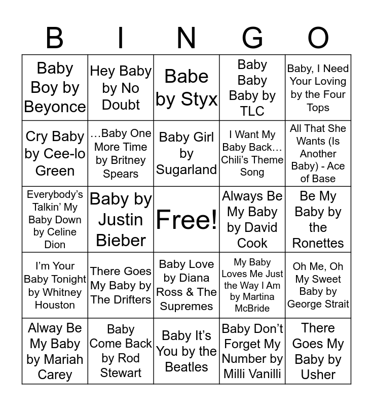 This bingo card has a free space and 39 words: Baby, Baby by Amy Grant, I Got You Babe by Sonny & Cher, Baby Got Back by Sir Mix-A-Lot, …Baby One More Time by Britney Spears, Alway Be My Baby by Mariah Carey, Baby Love by Diana Ross & The Supremes, Baby Girl by Sugarland, Ice Ice Baby by Vanilla Ice, Baby, I Need Your Loving by the Four Tops, I’m Your Baby Tonight by Whitney Houston, Baby by Justin Bieber, Baby Baby Baby by TLC, There Goes My Baby by Usher, Be My Baby by the Ronettes, Always Be My Baby by David Cook, There Goes My Baby by The Drifters, Runaway Baby by Bruno Mars, Baby Boy by Beyonce, Born to Be My Baby by Bon Jovi, My Baby Loves Me Just the Way I Am by Martina McBride, Cry Baby by Cee-lo Green, Baby It’s You by the Beatles, I Want My Baby Back… Chili’s Theme Song, All That She Wants (Is Another Baby) - Ace of Base, American Baby by Dave Matthews Band, Nobody Puts Baby in a Corner by Fall Out Boy, Baby by Brandy, Baby Now that I’ve Found You by The Temptations, Don’t Worry Baby by the Beach Boys, Hey Baby by No Doubt, Come On Over Baby by Christina Aguilera, Can’t Get Enough Of You Baby by Smash Mouth, Babe by Styx, Baby Come Back by Rod Stewart, Baby Don’t Forget My Number by Milli Vanilli, Baby You’re a Rich Man by The Beatles, Oh Me, Oh My Sweet Baby by George Strait, Everybody’s Talkin’ My Baby Down by Celine Dion and Ain’t That Lovin’ You Baby by Elvis.