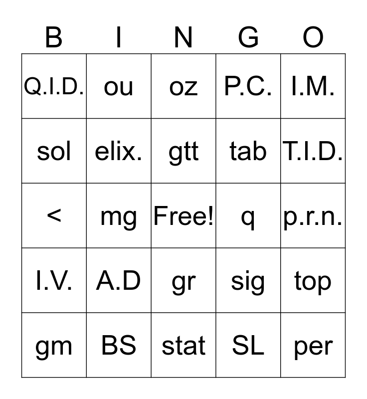 This bingo card has a free space and 39 words: A.C, B.I.D., cap, elix., gm, gr, gtt, H.S., I.M., I.V., mg, P.C., per, p.r.n., q, A.D, Q4H, Q.I.D., Q.O.D., sig, sol, stat, tab, T.I.D., Ung, B.P., BM, Void, od, ou, os, po, oz, BS, SL, VS, top, < and >.