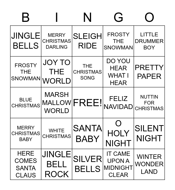This bingo card has a free space and 24 words: WHITE CHRISTMAS, JINGLE BELL ROCK, THE CHRISTMAS SONG, HERE COMES SANTA CLAUS, LITTLE DRUMMER BOY, JINGLE BELLS, FROSTY THE SNOWMAN, MERRY CHRISTMAS DARLING, FELIZ NAVIDAD, SANTA BABY, DO YOU HEAR WHAT I HEAR, BLUE CHRISTMAS, O HOLY NIGHT, SILENT NIGHT, JOY TO THE WORLD, IT CAME UPON A MIDNIGHT CLEAR, NUTTIN FOR CHRISTMAS, SLEIGH RIDE, PRETTY PAPER, MARSH MALLOW WORLD, WINTER WONDER LAND, MERRY CHRISTMAS BABY, FROSTY THE SNOWMAN and SILVER BELLS.