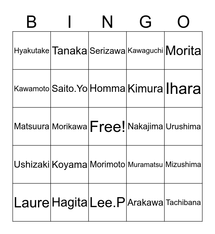 This bingo card has a free space and 95 words: Agata, Akita, Arakawa, Chiba, Dan, Furihata, Goto, Hagita, Hagiwara, Hamagawa, Hasegawa, Hatta, Hirochi, Homma, Hori, Hyakutake, Ihara, Ishikawa, Isshiki, Ito.J, Ito.Y, Kaji, Kashiwagi, Kato, Kawaguchi, Kawamoto, Kikuchi, Kimura, Kobayashi, Komura, Koyama, Kubo, Kusano, Kusayanagi, Laure, Lee.D, Lee.P, Luiz, Matsuura, Mizusaki, Mizushima, Morikawa, Morimoto, Morita, Muramatsu, Nakajima, Nakano, Nishimoto, Noda, Nomura, Noshiro, Ogata, Ogawa, Ohori, Okada.S, Okada.H, Okue, Ozawa, Paul, Mario, Saito.Yo, Saito.Yu, Saitou.D, Sakthi, Sato.J, Sato.T, Sekiguchi, Sekiya, Serizawa, Shimizu, Suminokura, Suzuki, Tachibana, Tagashira, Takahashi, Takashima, Takeda, Takeuchi, Tanabe, Tanaka, Tsuchiya, Tsutsui, Umehara, Urano, Urushima, Ushizaki, Villevieille, Wakisaka, Wakita, Yamaguchi, Yamamoto, Yamasaki, Yamauchi, Yokoi and Yokota.