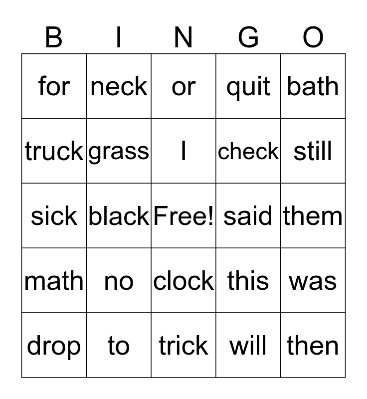 This bingo card has a free space and 28 words: was, trip, check, will, truck, or, neck, math, said, drop, sick, quit, to, trick, still, brush, no, grass, I, clock, for, duck, then, black, them, this, bath and off.